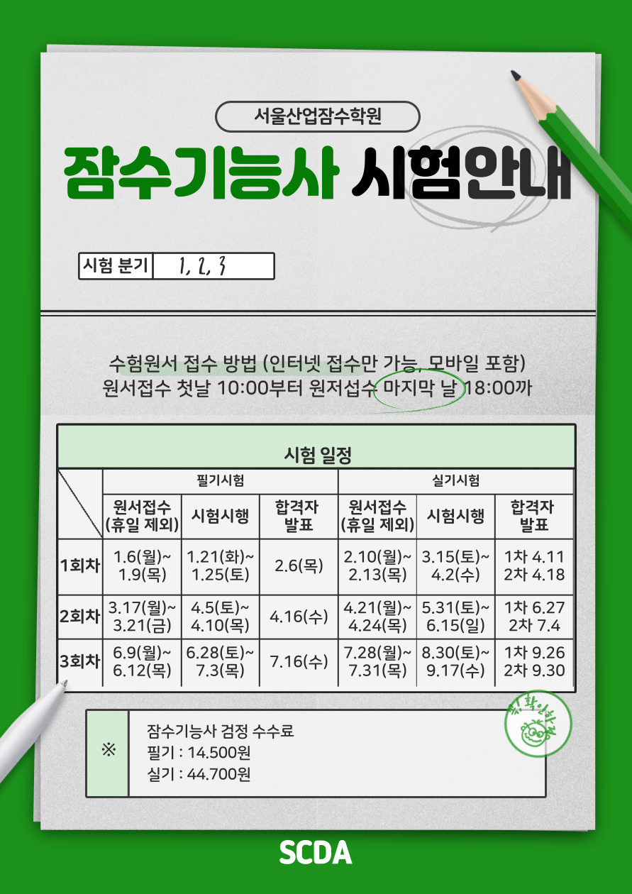 2025³â 3ȸ Àá¼ö±â´É»ç Á¤±Ô ¹× ½Ç±â Ưº° ÇÒÀÎ ¾È³» 🌊¼¿ï»ê¾÷Àá¼ö¾ÆÄ«µ¥¹Ì, ±¹¸³±º»ê´ëÇб³ ÇØ¾ç»ê¾÷±â¼ú±³À°¼¾ÅÍ, ±×¸®°í Á¦ÁÖÁöÁ¡¿¡¼2025³â Á¦2ȸ Àá¼ö±â´É»ç ÀÚ°ÝÁõ ÃëµæÀ» ²Þ²Ù´Â ¿©·¯ºÐÀ» À§ÇØ